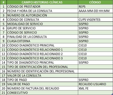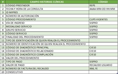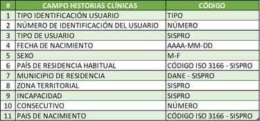 A continuación se presenta la información puntual que será solicitada en el archivo de rips, en las tablas, la columna código se encuentra la manera en que debe ser registrada la información en la historia clínica o tabla de referencia donde se obtiene la información.